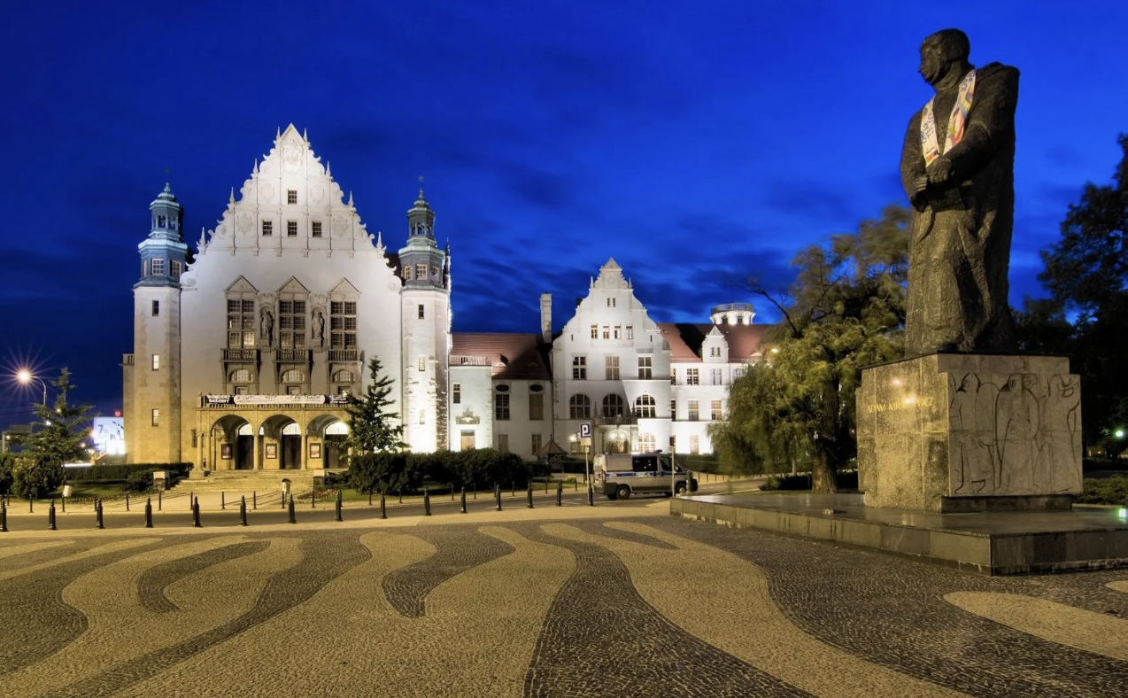 Из Университетской аудитории открывается захватывающий вид на Немецкий театр, построенный в 1910 году по проекту Макса Литтмана. Когда-то он был объявлен сценой, на которой не звучало ни одного польского слова, а теперь является известным Большим театром им. На этом святом месте состоялись мировые премьеры музыкальных произведений, которые эхом вошли в анналы истории польской культуры.