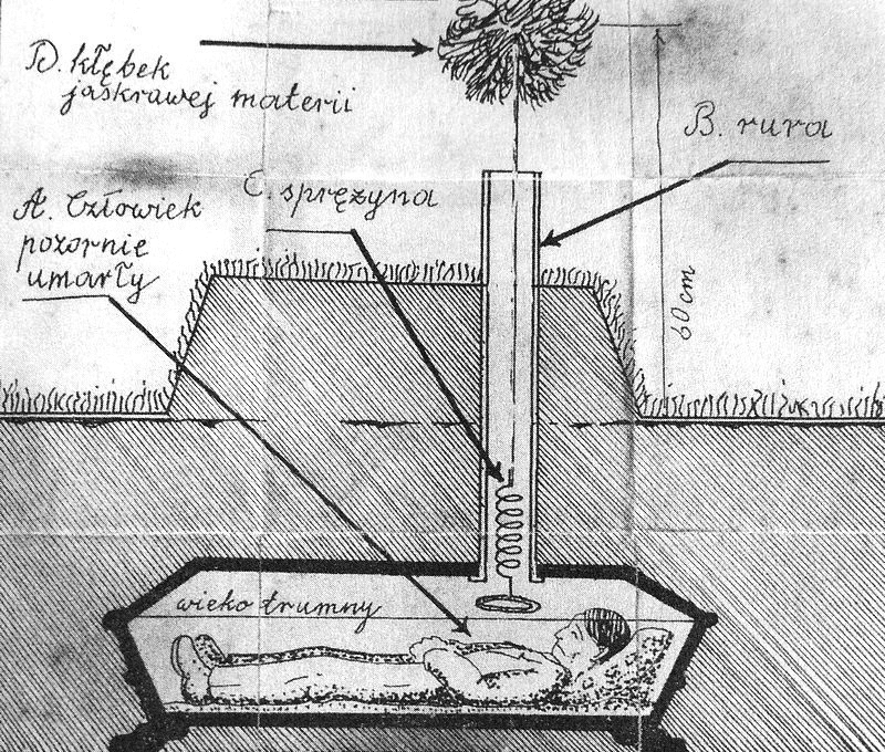 Идея была такова: похороненный после пробуждения, коснется до клубка ниток или перьев, тем самым заставит сработать пружину. Она пробьёт дно трубы на поверхности и в гроб автоматически попадет воздух. Из трубы вылетит пружина и отлетит примерно на 60 сантиметров – это и будет сигналом на поверхности, что захороненный живой.