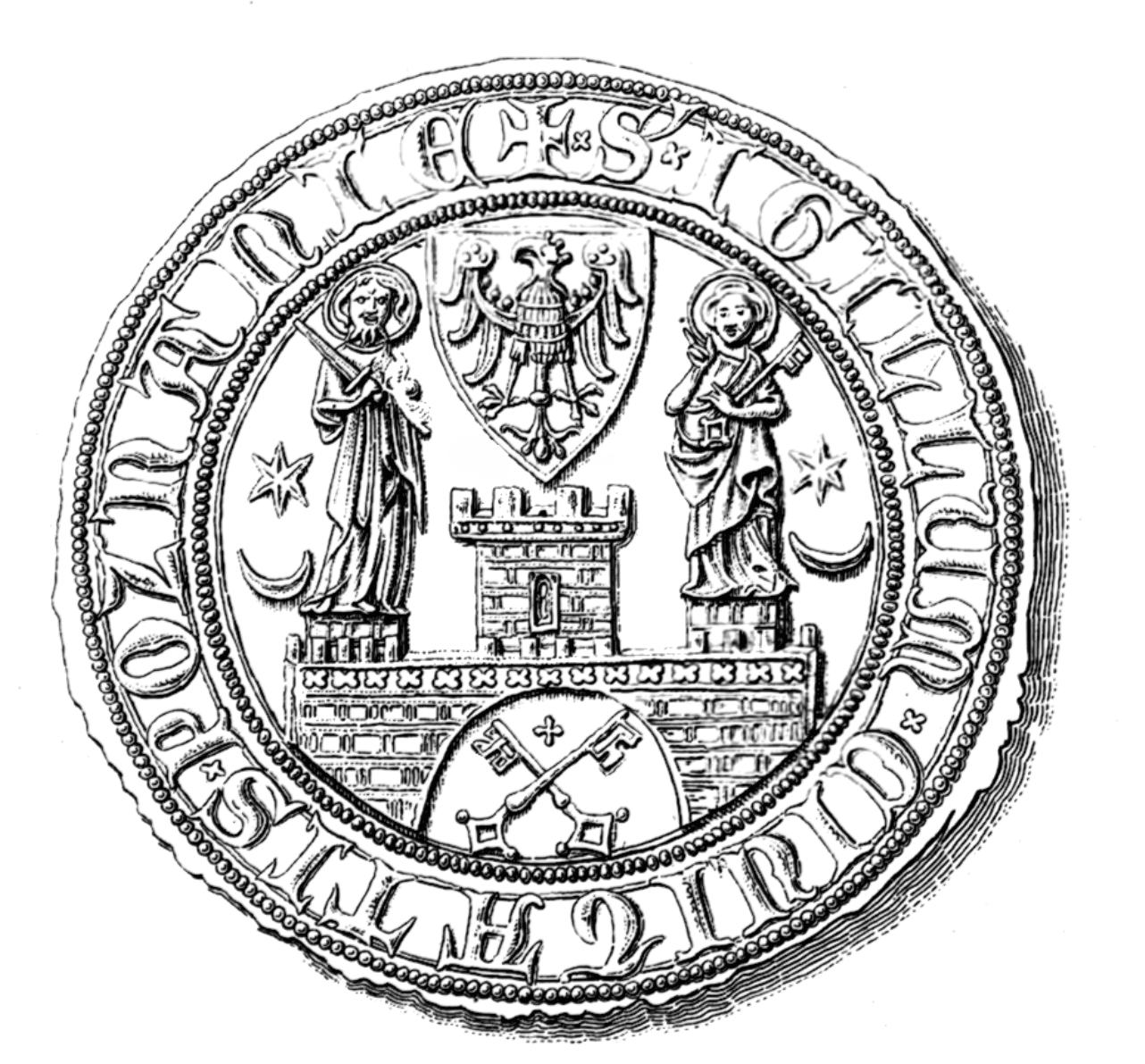 На початку 14 століття перший герб Познані з’явився на міських печатках. На великій таємній печатці, датованій цим періодом, була зображена фортечна брама з трьома вежами. Над брамою ширяв орел без корони, що символізував князів-засновників міста – Пшемисла І та Болеслава Благочестивого. Святі Петро і Павло, покровителі міста, фланкували браму, тримаючи в руках ключ і меч відповідно. Зірки, півмісяці та перехрещені ключі прикрашають герб, формуючи візуальну оповідь про середньовічну ідентичність Познані.